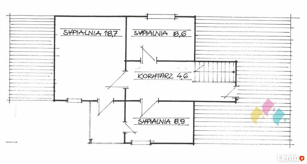Poddasze mieści trzy sypialnie (ok. 8,9 m2, ok. 8,6 m2, ok. 18,7 m2),